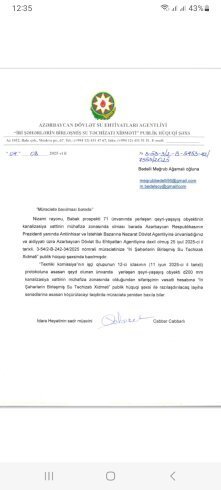 Su, kanalizasiya rüşvətinə, korrupsiyasına baxın, “Azərsu” 11 il qabaq (06.01.2015-ci il tarixıi) texniki şərt verib və obyektin altından SU, KANALİZASİYA XƏTTİNİN KEÇMƏDİYİNİ təsdiq edib. (Keçsə idi, texniki şərt verilməzdi ). ADSEA İri Şəhərlərin Birləşmiş Su Təchizatı Xidməti (PHŞ-nın idarə heyətinin sədr müavini Cabbar Cabbarlı) isə 04.08.2025-ci il tarixli məktubla bildirib ki, obyekt kanalizasiya xəttinin mühafizə zonasında olduğundan 1-ci dərəcəli Qarabağ qazisinin vəsaiti hasabına köçürüləcəyi halda müraciətə yenidən baxıla bilər.(?)